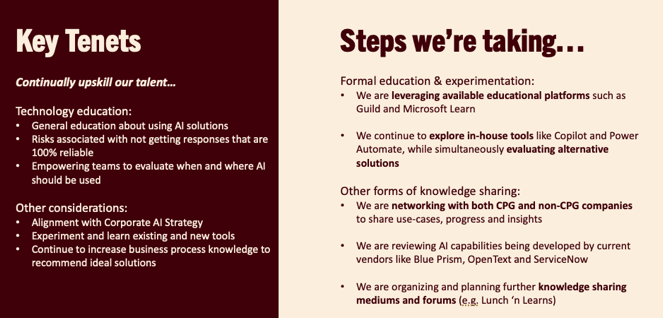 Key learnings from the presentation included a listing of GenAI enabled automation opportunities, and a separate list of more quantitative analysis opportunities with GenAI.